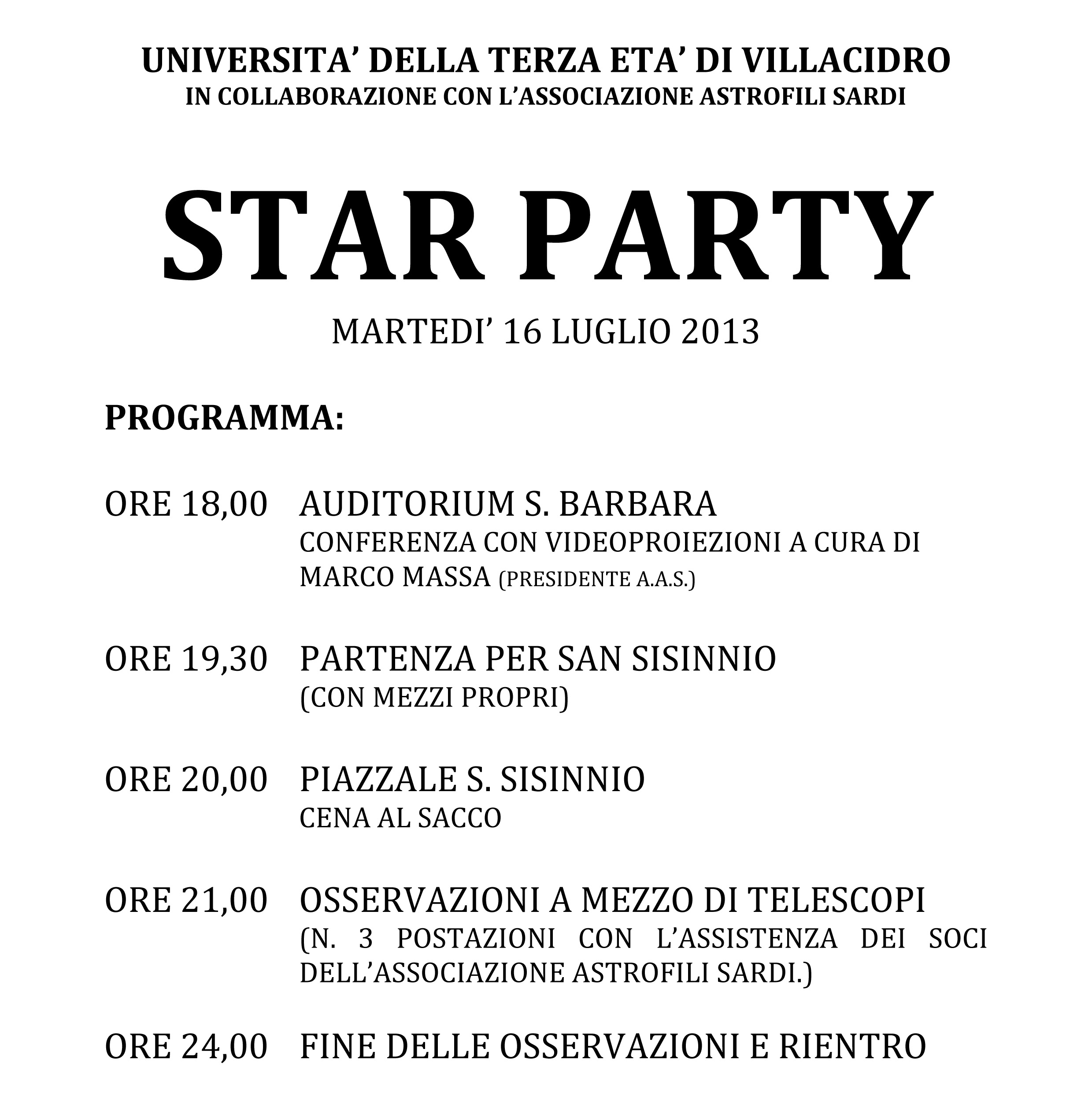 Il programma della serata, organizzato dall’associazione astrofili sardi, in collaborazione con l’associazione "mettiamo radici" di Fluminimaggiore, prevede l’inizio della manifestazione alle ore 21,15 con conferenza all’aperto e video proiezione di una serie di immagini riguardanti le migliori fotografie riprese dai soci dell’A.A.S., con commento delle stesse e illustrazione delle conoscenze riguardanti il sistema solare, le stelle e le galassie dell’Universo. Dalle 22.15 alla mezza notte si effettueranno le osservazioni di Saturno , stelle, nebulose e degli ammassi stellari con l’utilizzo di n. 3 telescopi. Nello stesso tempo, poiché non tutti potranno osservare attraverso gli strumenti, si provvederà ad intrattenere chi attende mostrando loro le costellazioni con un sottile fascio laser luminoso e, rispondendo alle curiosità riguardanti i fenomeni celesti, si indicheranno le stelle utili per l’ orientamento in cielo con la ricerca della stella Polare.